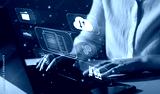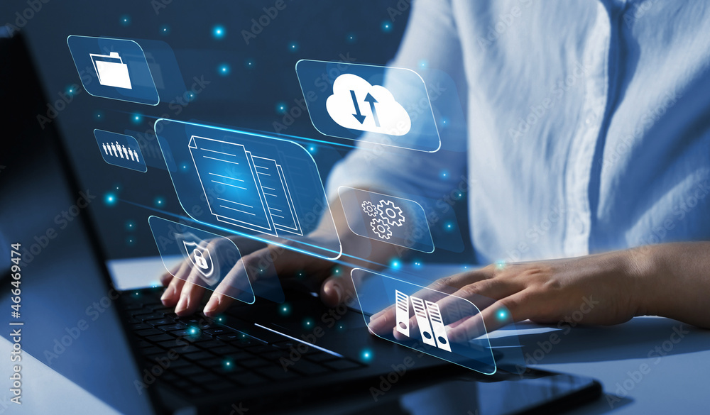 Business woman using a laptop with digital graph to document management. Software online documentation database and digital file storage system and file access concept.Enterprise resource planning.
