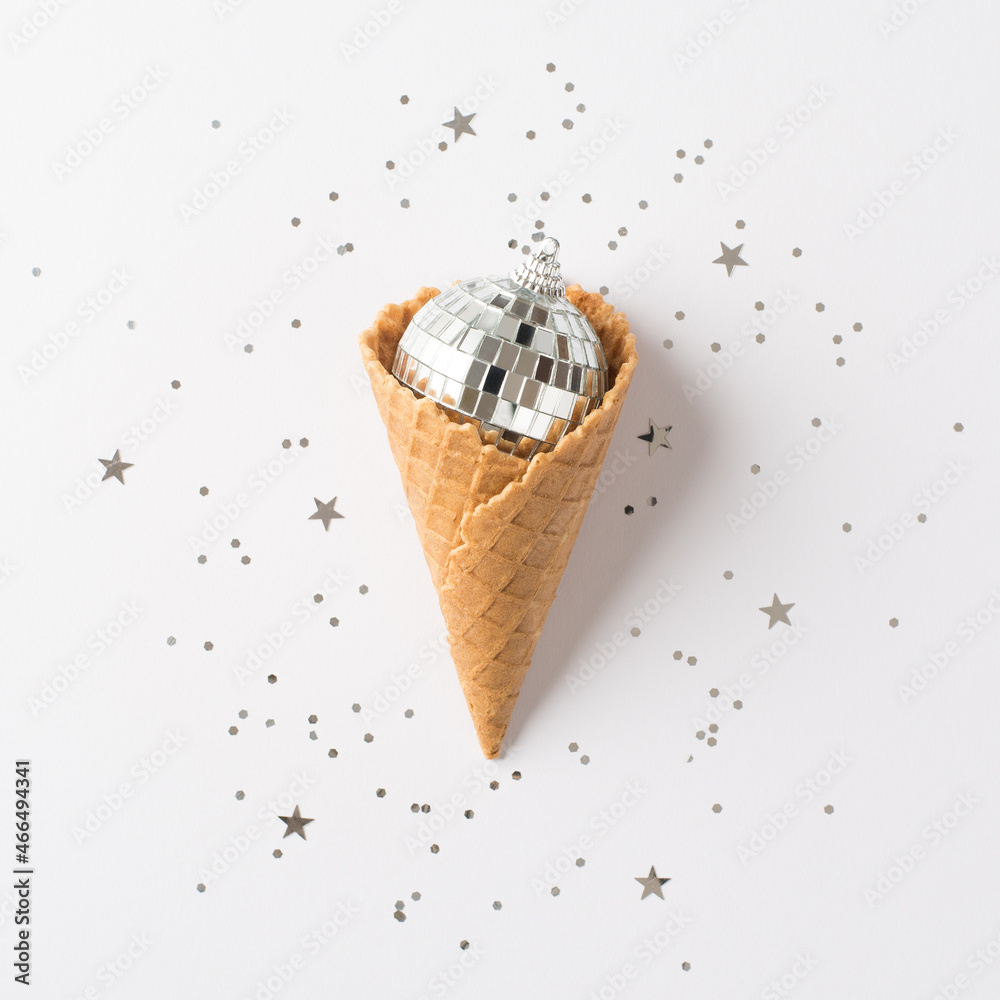 Top view photo of ice cream cone with christmas tree disco ball and silver confetti on isolated white background
