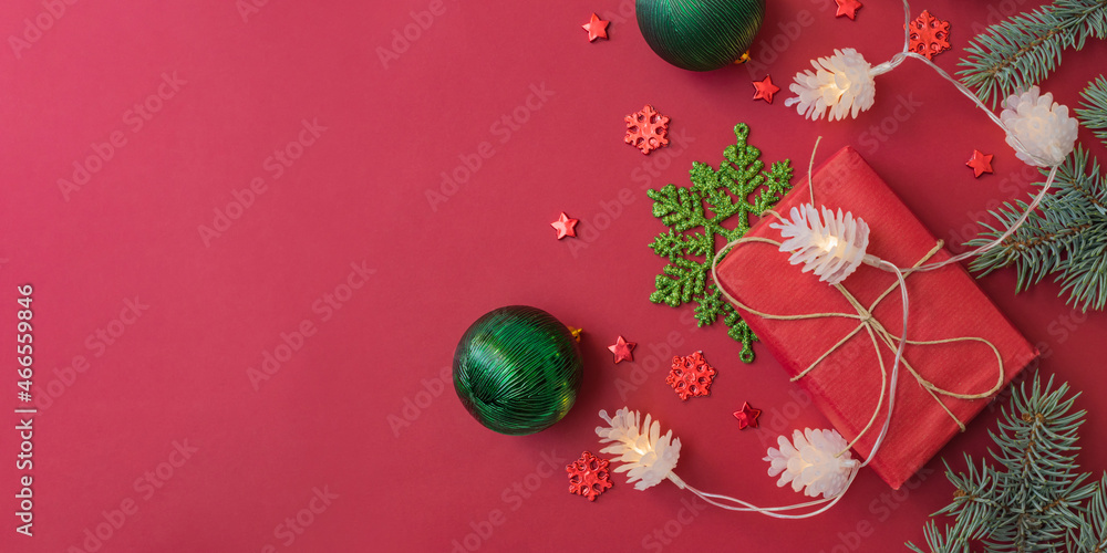 Flat lay frame with fir branches, christmas baubles decoration and gift box on a red background