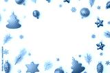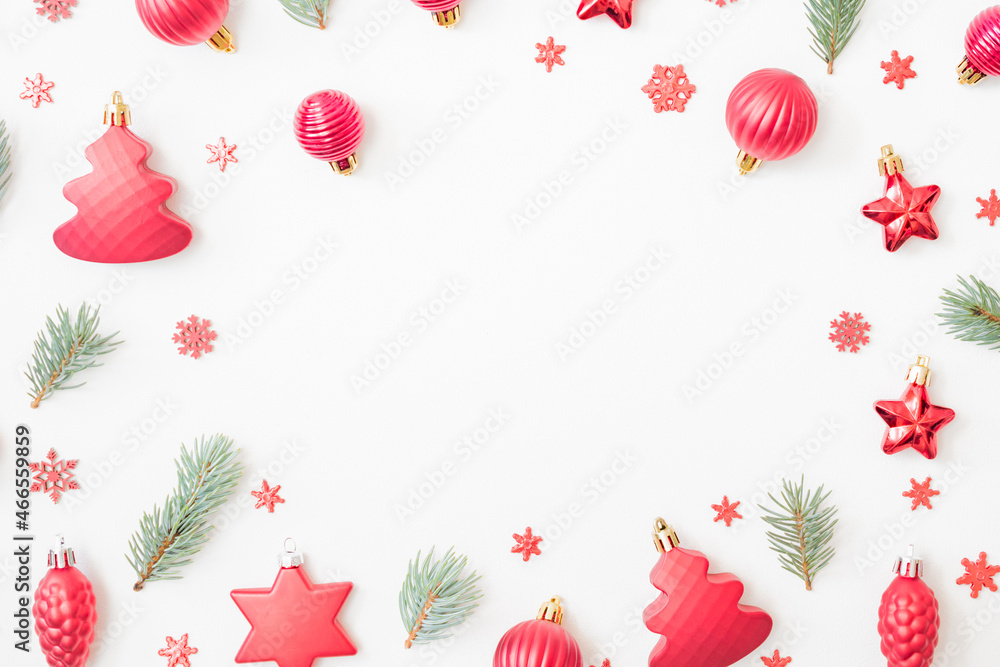 Flat lay frame with fir branches, christmas balls and decorations on a white background