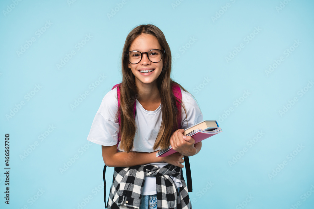 Happy laughing smiling caucasian teenager schoolgirl student pupil holding books and copybooks, getting excellent marks, going back to school isolated in blue background