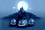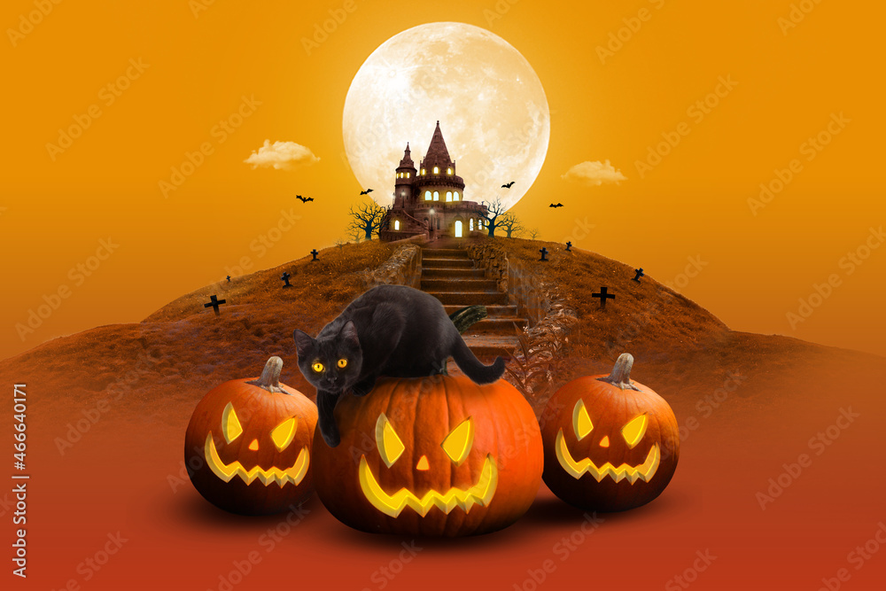 Halloween night moon composition with glowing pumpkins vintage castle and bats flying , Scary Pumpkins And Dark Forest with ghost , yellow tone , 3D rendering