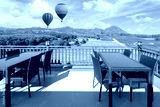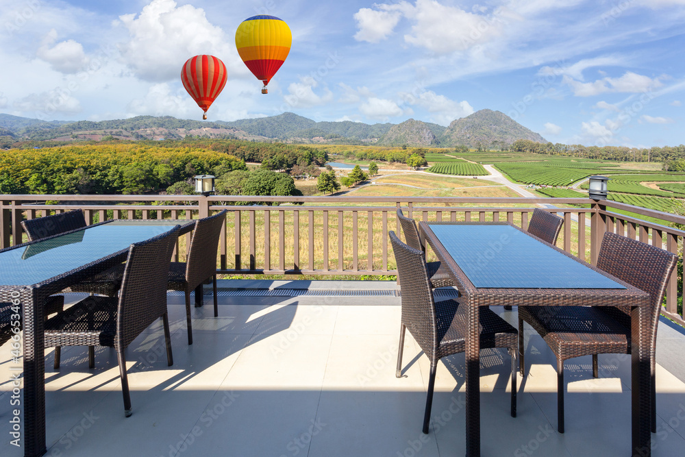 Colorful hot air balloons flying over Choui Fong green tea plantation one of the beautiful agricultural tourism spots in Mae Chan District, Chiang Rai Province