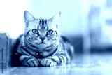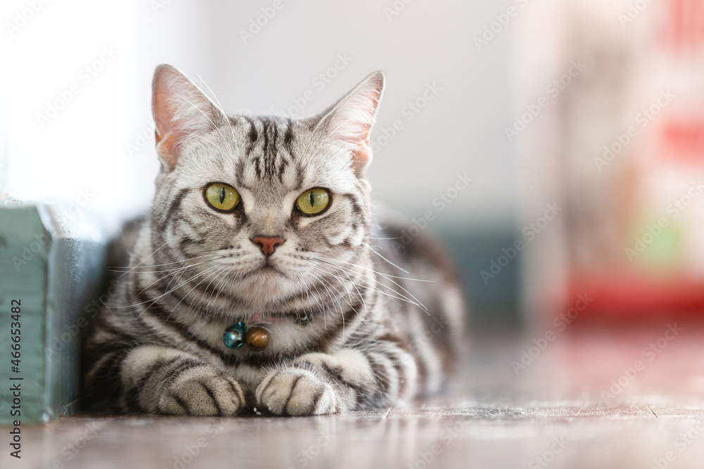 Close up American shorthair relaxing in the house.