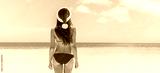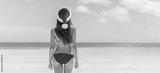 Christmas vacation Caribbean winter holiday woman wearing santa hat view from behind. Red bikini in sunny getaway girl relaxing walking.