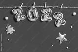 New Year 2022 silver balloons number and soft toys shape as Christmas tree and bright star, hanging above red cloth background. Happy holidays frame