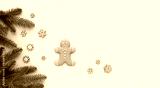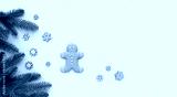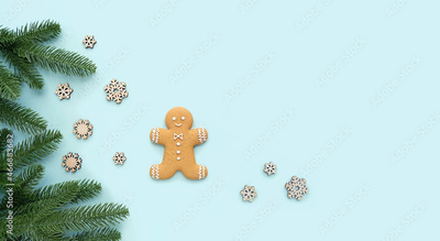 christmas tree branches, gingerbread man and snowflakes on blue background. Winter festive season. Christmas and New Year holidays symbol. flat lay. copy space
