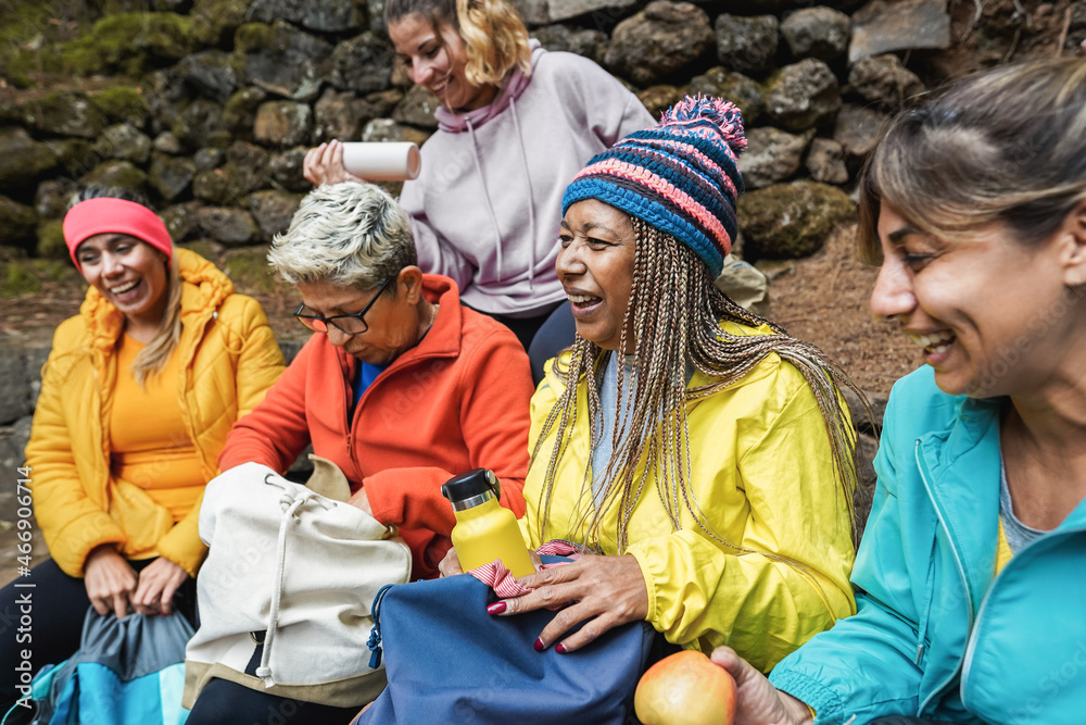 Multiracial women having fun taking a break after trekking day in to the wood - Focus on african woman face