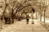 Mom and daughter walk in autumn park. Little girl after school with mother from back. Everyday life