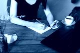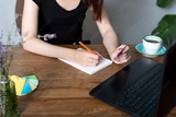 a young woman sits in front of a laptop with a pencil and a credit card in her hands and makes purchases on the Internet