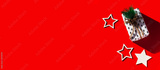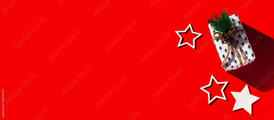 Christmas trendy composition with eco crafted with cone and xmas tree gift and wood stars. Natural and minimal new year concept, top view, isolated, flat lay, copy space on red background banner