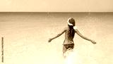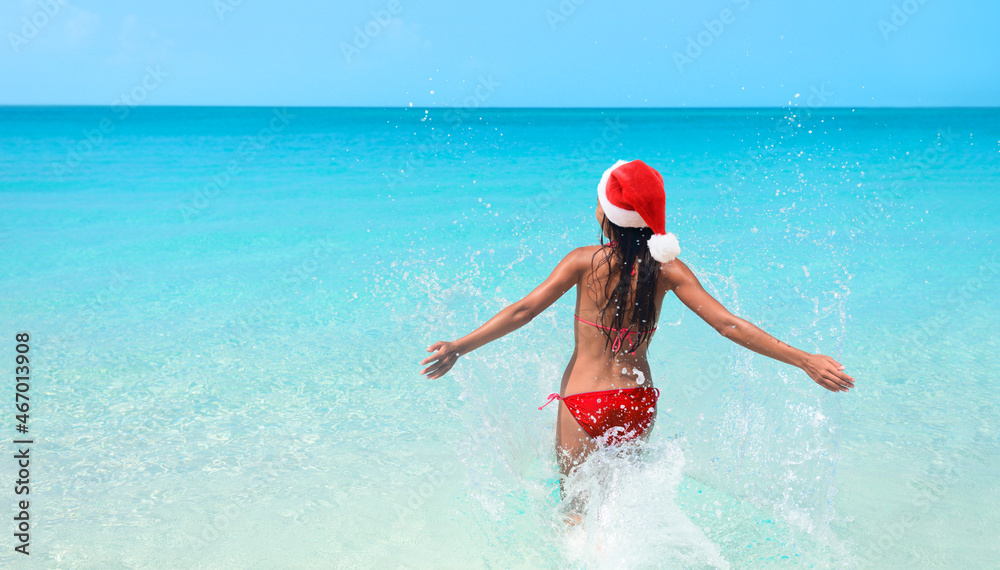 Christmas fun happy bikini woman swimming in paradise turquoise beach ocean wearing santa hat happy with open arms. Dream destination for Xmas holidays getaway. Panoramic banner.