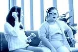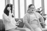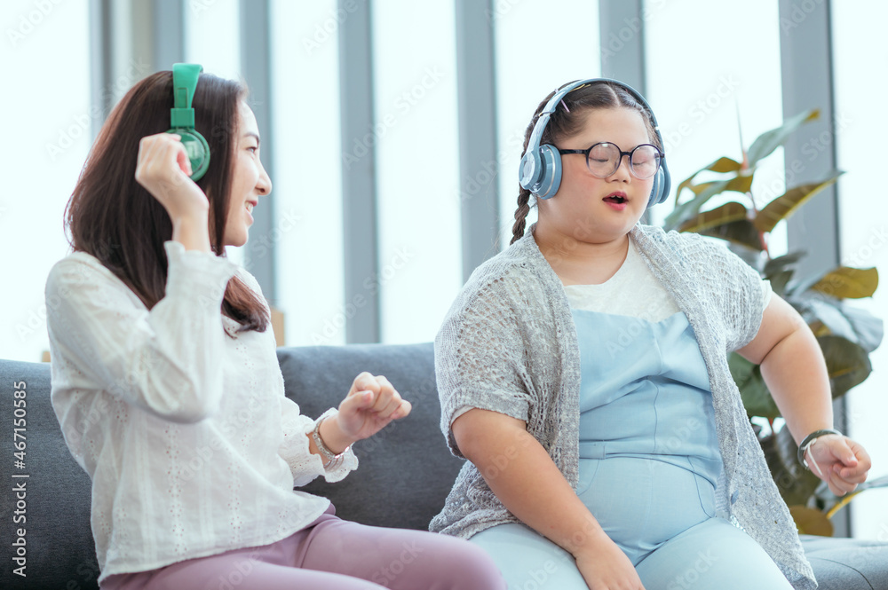 Autistic girl is listening to music and singing with her mother during her holiday home.