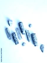 bunches of white California sage on a white background, minimalism and a place for text. sacred incense, aromatherapy and meditation