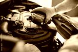 Close- up of mechanic pours motor oil while doing car engine maintenance at auto repair shop.