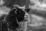portrait of a black and white four horned Jacob sheep looking at camera while standing in the field