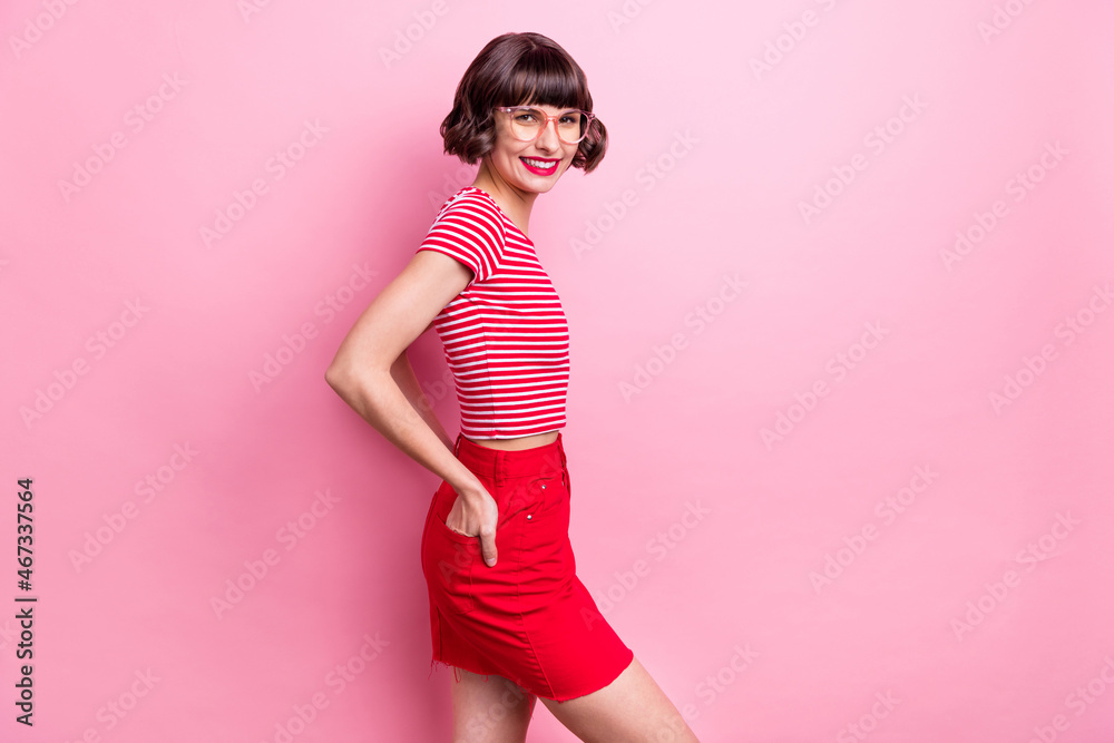 Photo portrait girl in glasses pretty wearing red clothes isolated pastel pink color background