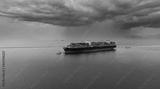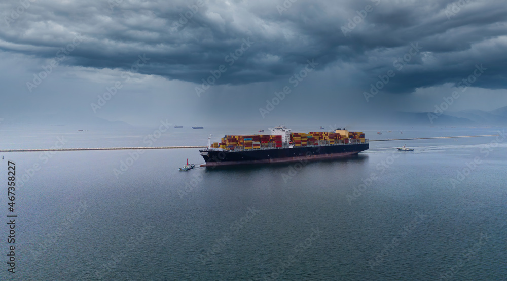 Bird eye view transportation logistics and container dock cargo yard and cargo plane flying with working crane bridge in shipyard with transport logistic import export with blue sky background.