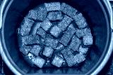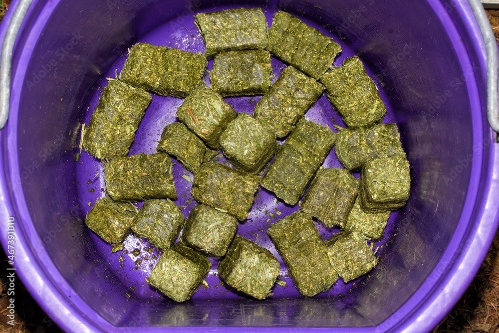 Green Alfalfa-timothy cubes in a purple bucket, ready to be soaked with water prior to feeding to a horse; alfalfa is a protein dense forage for horses