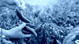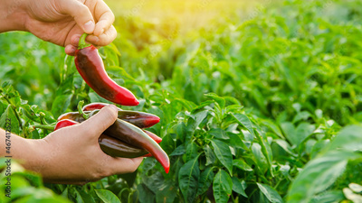 The farmer holding fresh peppers in the hand. Red hot pepper bush. Growing organic vegetables. Autumn harvesting concept. Selective focus