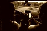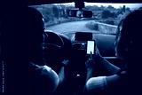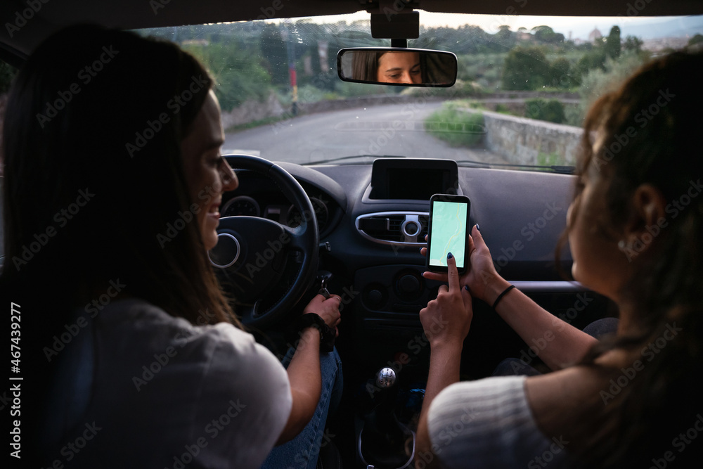 Two young women in a car on a road trip in the evening at sunset check the map on smartphone to geo locate their location to get destination - Millennials have fun together on vacation