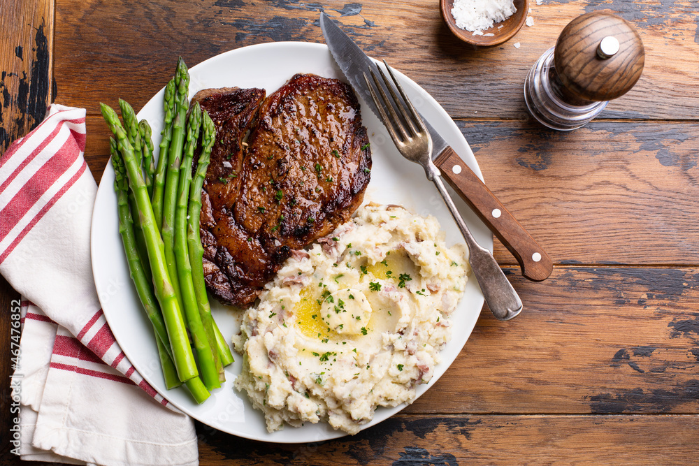 Traditional steak and mashed potatoes with asparagus