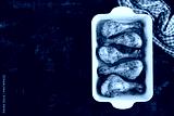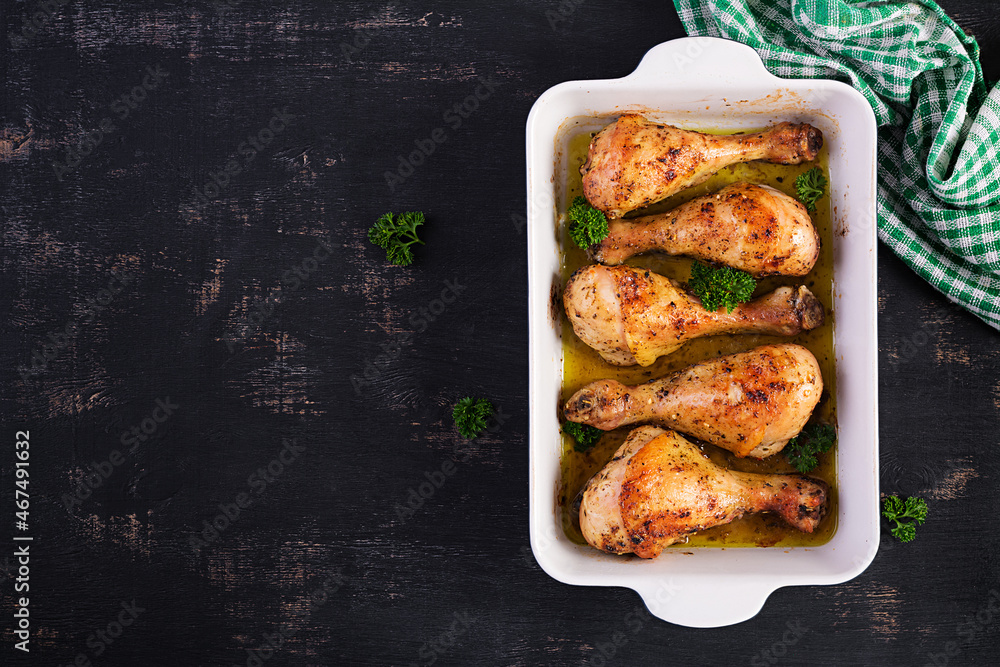Baked chicken drumsticks on a dark background. Top view, flat lay