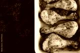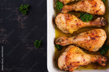 Baked chicken drumsticks on a dark background. Top view, flat lay