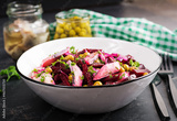 Salad with herring, green peas and beetroot filled with vegetable oil on a dark table.