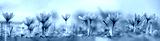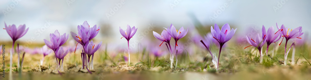 Saffron flowers on ground, crocus sativus purple blooming plant field panorama, harvest collection