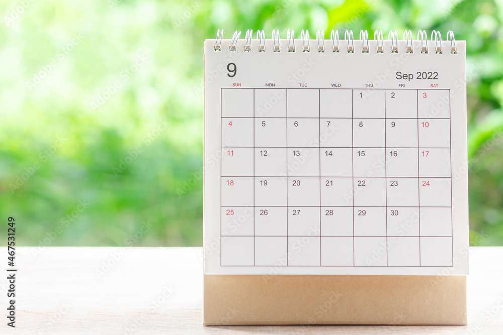 September month, Calendar desk 2022 for organizer to planning and reminder on wooden table with green nature background.
