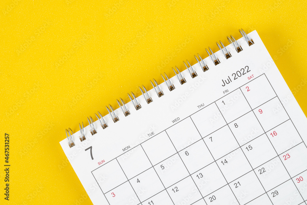 July month, Calendar desk 2022 for organizer to planning and reminder on yellow background.