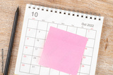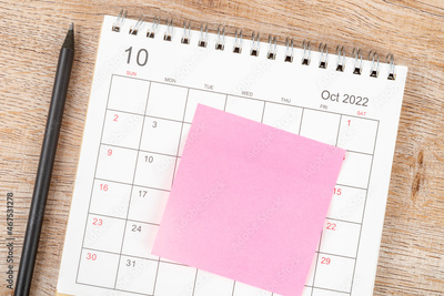 Top view calendar desk 2022 on October month, Calendar planning and pencil with sticky note on wooden background.