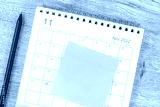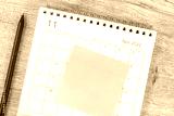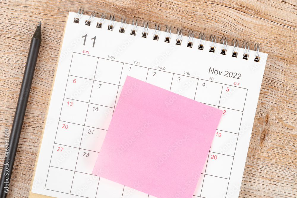 Top view calendar desk 2022 on November month, Calendar planning and pencil with sticky note on wooden background.