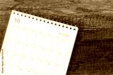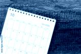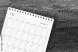 Top view calendar desk 2022, Calendar planning in October month on wooden table background.