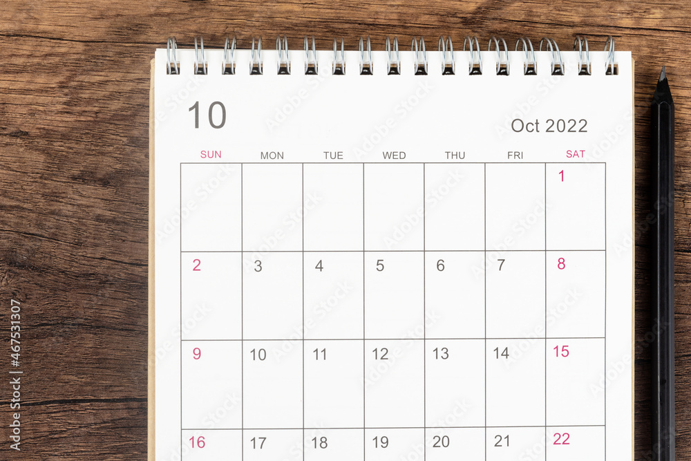 Top view calendar desk 2022, Calendar planning in October month and pencil on wooden table background.