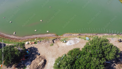 Top view a lakeside lighted boardwalk installation at Rheudasil Park, Flower Mound, Texas, USA