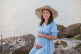 pregnant woman sitting the rocks near the sand beach and the sea.