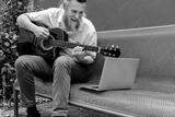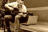 Mature caucasian man sitting on a bench learning to play the guitar with online classes using laptop.