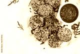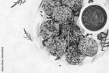 Delicious chicken meat patties with garlic tomato sauce. Diet food. Top view, overhead