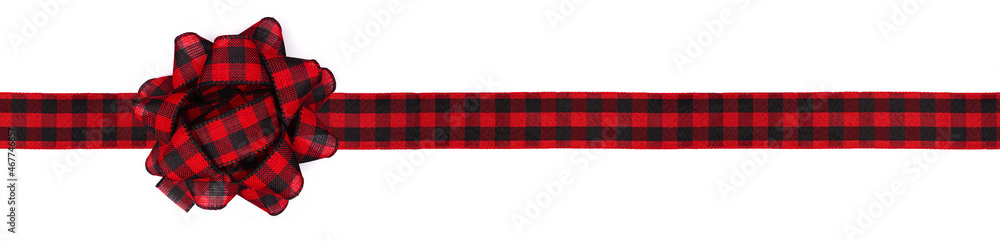 Christmas gift bow and ribbon with red and black buffalo plaid pattern. Long border isolated on a white background.
