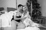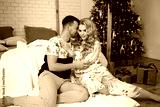 young couple in love sitting on floor near bed at home on Christmas tree on background