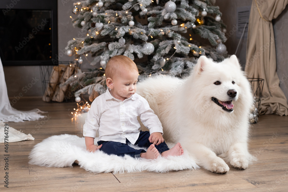 child boy with dog samoyed near Christmas tree at festive decorated home