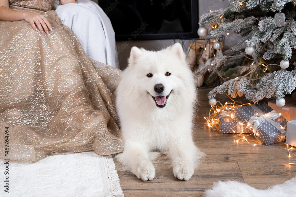 happy fluffy samoyed dog sits at home near a decorated christmas tree