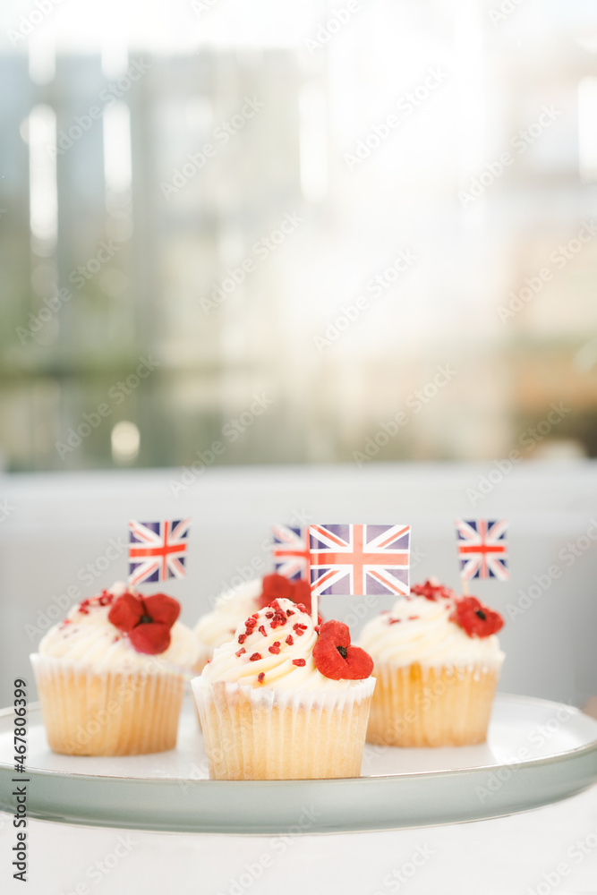 Cupcake with British Union jack flag and poppy flower. Remembrance Day. Vertical card. Selective focus, copy space.