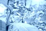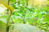 Young teak tree and sprinkler watering green plant in agriculture field. Sprinkler for agriculture. Garden irrigation system. Sprinkler maintenance service. Save the earth. Tree plantation for oxygen.