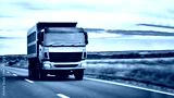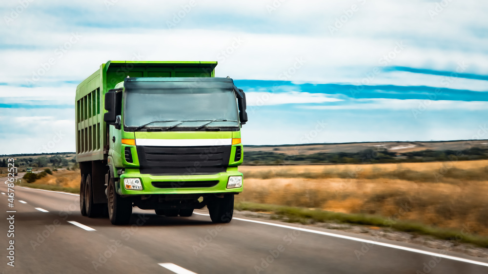 green truck rushes along country road against background of field from road perspective.