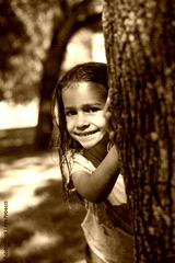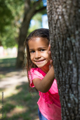 Portrait of cute little girl in park. Dark-haired girl peeking out from tree, smiling, looking at camera. Family, love, childhood concept