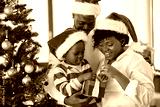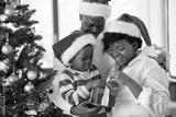 family, winter holidays and people concept - happy african american mother, father and little son opening gift box at home on christmas