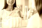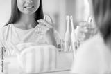 beauty, people and make up concept - teenage girl spraying perfume at home bathroom